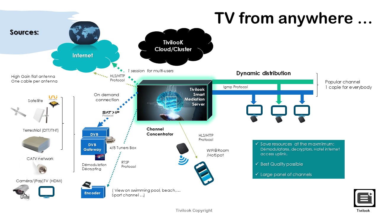 Tivilook est une plateforme de divertissement innovante conçue pour dynamiser aussi bien les téléviseurs traditionnels que les Smart TV. Tivilook s’adresse aux marchés de l’hôtellerie, des hôpitaux, des maisons de retraite (EHPAD) et des collectivités sociales. Sa flexibilité permet une adaptation parfaite, qu’il s’agisse d’un petit Bed & Breakfast ou d’un hôtel de luxe de grande envergure. La passerelle Tivilook Gateway est une solution clé en main qui transforme les écrans traditionnels en supports interactifs. Elle permet d’afficher des notifications, de créer des chaînes locales dédiées pour des services variés tels que la quasi-VOD (NearVoD), les actualités locales, les événements, des albums photo ou encore des clubs cinéma, répondant ainsi aux attentes des seniors grâce à une technologie zéro contact. En tant que plateforme IPTV complète, Tivilook propose de nouveaux services personnalisés pour les hôtels, les hôpitaux ou les collectivités. Elle fonctionne sur des téléviseurs classiques via notre décodeur Android IP, sur des Smart TV Android, ainsi que sur des smartphones et tablettes (BYOD). Les fonctionnalités de Tivilook incluent le réveil, les prévisions météo, les services en chambre, les excursions en ville, les visites touristiques, la promotion des produits locaux et des activités culturelles, les offres promotionnelles, le sport, le fitness, les massages, un check-in/check-out simplifié et rapide, le profilage des clients, le Wi-Fi en chambre, et même de l’affichage numérique.
